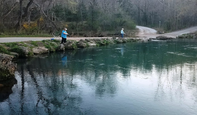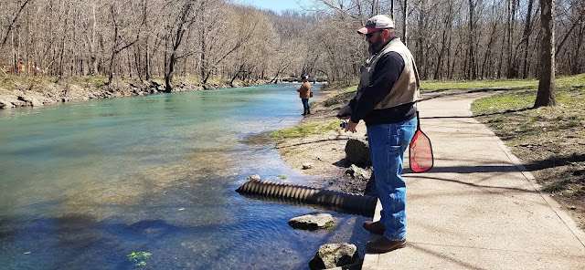Fishing has been amazing! The warmer weather is giving us some great fishing with dry flies in the afternoons and evenings. There is nothing quite like the visual provided by a trout rising to engulf a fly. This visual also provides a knee-jerk reaction of excitement that yanks the fly out of the trouts' mouth! The water has some residual stain from our springtime rain a few weeks ago. The stream looks great for this time of year compared to years gone by. The stream is stocked in correlation with the tag sales at Bennett Spring State Park. As the weather continues to get warmer we will see more people flock to the stream, which increases the amount of trout in the stream.